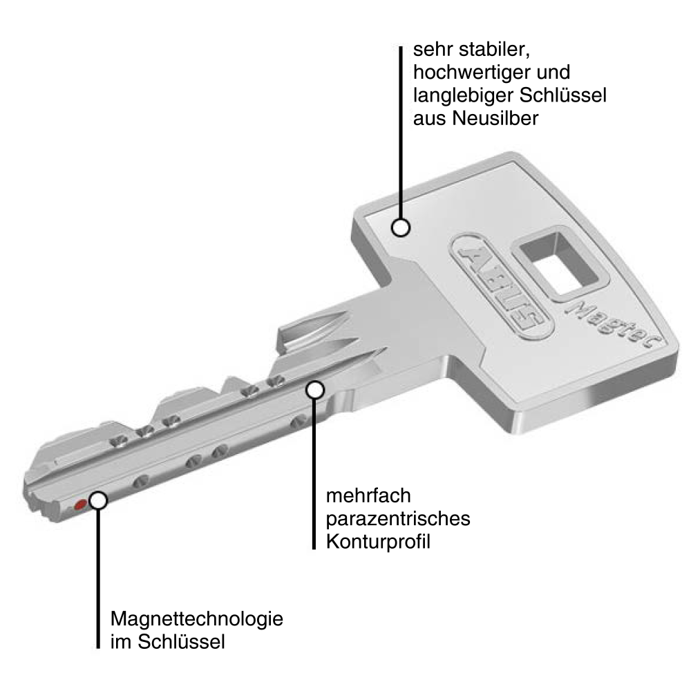 ABUS Magtec™ bildet jenes moderne klassische Schließkonzept vom Hause ABUS Pfaffenhain. Jene zukunftsweisende Magnet-Technik in Zylindern sowie an Schlüsseln verspricht Kunden einen extrem starken Schutz gegen unbefugte Schlüssel-Duplikate beziehungsweise Manipulation dieser Schließ-Systeme. Dank jenem im Schlüssel integrierten Magneten bleibt das Produkt ebenso vor 3D Druck gesichert. Zwecks höchster Anpassbarkeit wurde der Zylinder mit der modularen ME-Technik versehen. Dieser kann daher jederzeit an Ihre Haustür adaptiert werden. volle Patent-Laufzeit bis 2038 (Recht beantragt) sowie zeitloser Markenschutz
