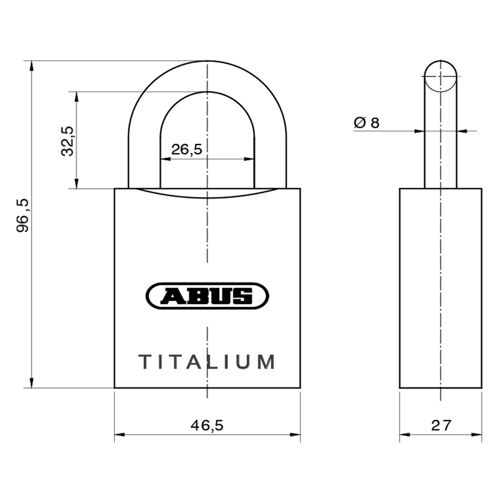 Abmessungen Klassische lichte Bügelhöhe 86TI/45: 32,5 mm Stahlbügel: Ø 8 mm Korpus-Breite: 46,5 mm Maß Einseit-Zylinder: 30,5/10 mm