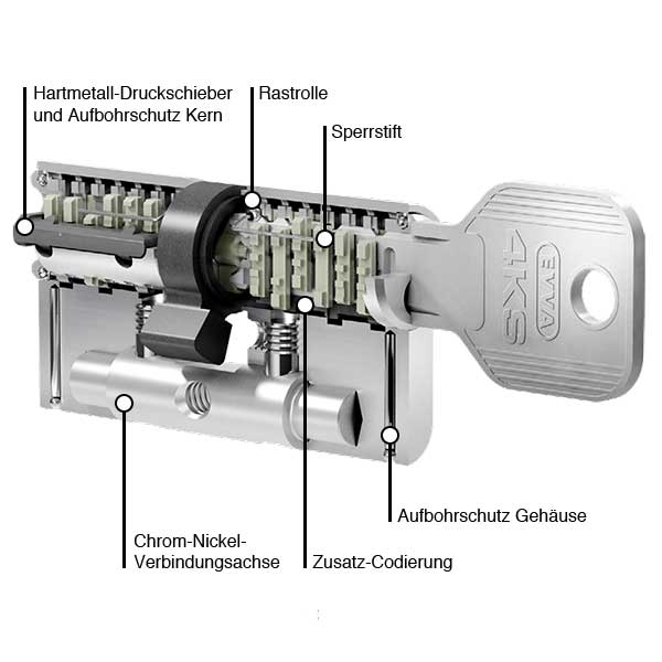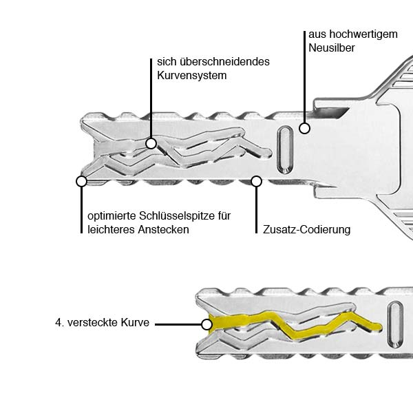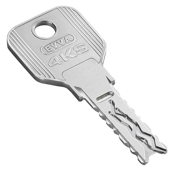 EVVA 4KS (4-Kurven-System) ist das widerstandsfähigste System unter den mechanischen Schließsystemen. Mit patentierter federfreier Kurventechnologie ist 4KS für den härtesten Einsatz geeignet wie z.B. hoch oben am Berg oder in Produktionsbetrieben mit hoher Schmutzbelastung. Der Wendeschlüssel bietet ein komfortables Ansteckverhalten und dreht sich leicht und leise im Zylinder. Selbstverständlich hat auch 4KS ein EVVA-eigenes Merkmal: Die sich überschneidende Kurvenfräsung. Diese garantiert höchste Sicherheit und schließt eine Schlüssel-Manipulation innerhalb der Schließanlage aus.