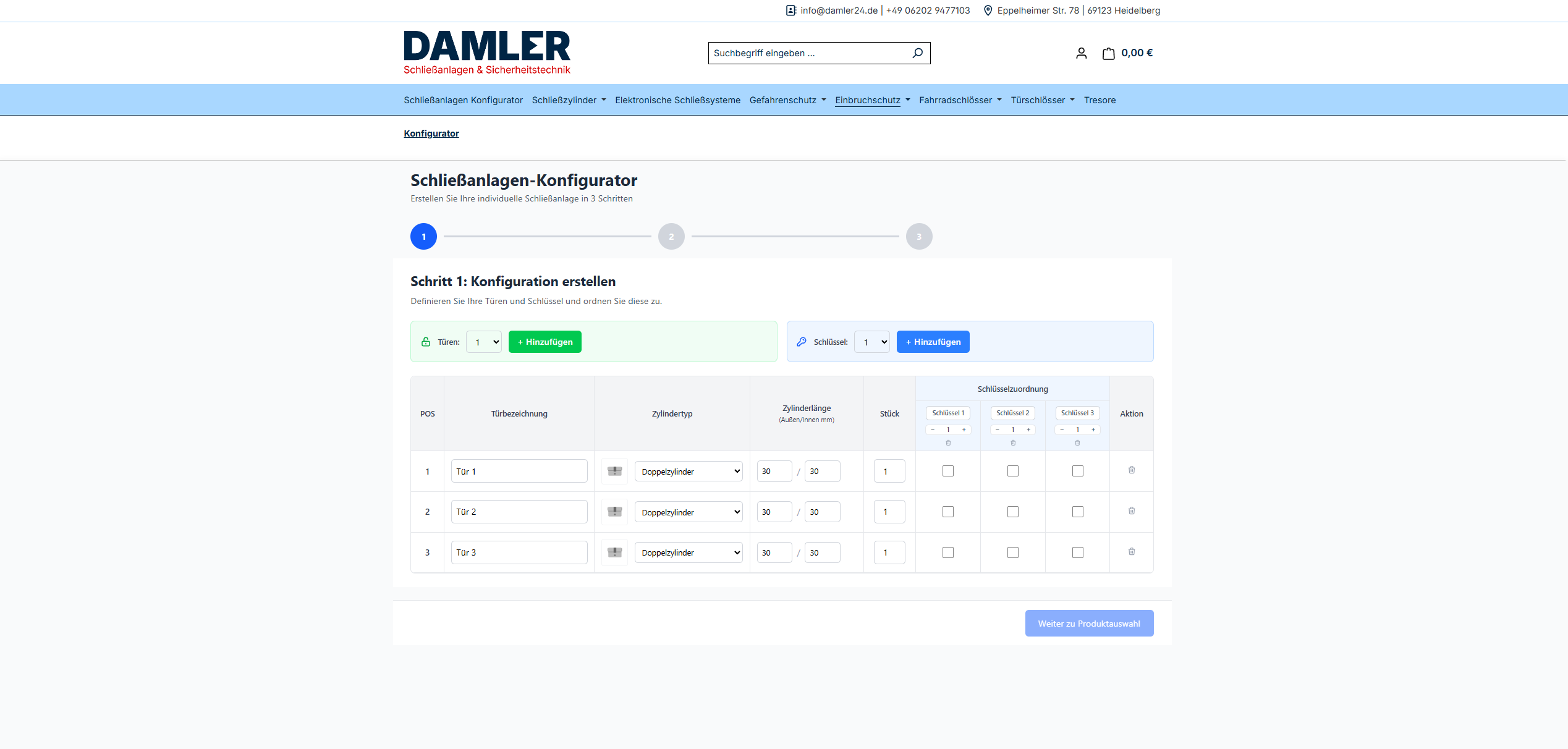 In diesem ersten Schritt legen Sie das logische Gerüst Ihrer Anlage fest. Der Damler24-Konfigurator nutzt eine intuitive Matrix, um Türen, Zylindertypen und Schließberechtigungen zu verknüpfen.