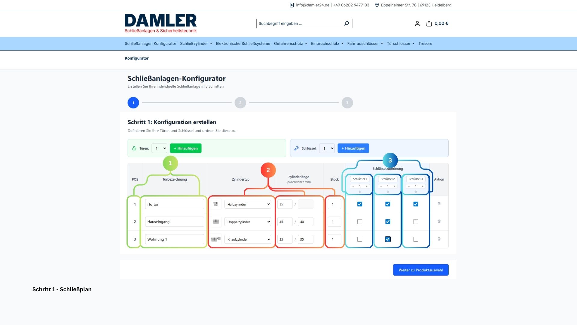 Überlegen Sie genau, welcher Schlüssel welche Tür öffnen soll. Im Konfigurator von Damler24 bilden Sie dies über eine intuitive Matrix (Schließplan) ab.